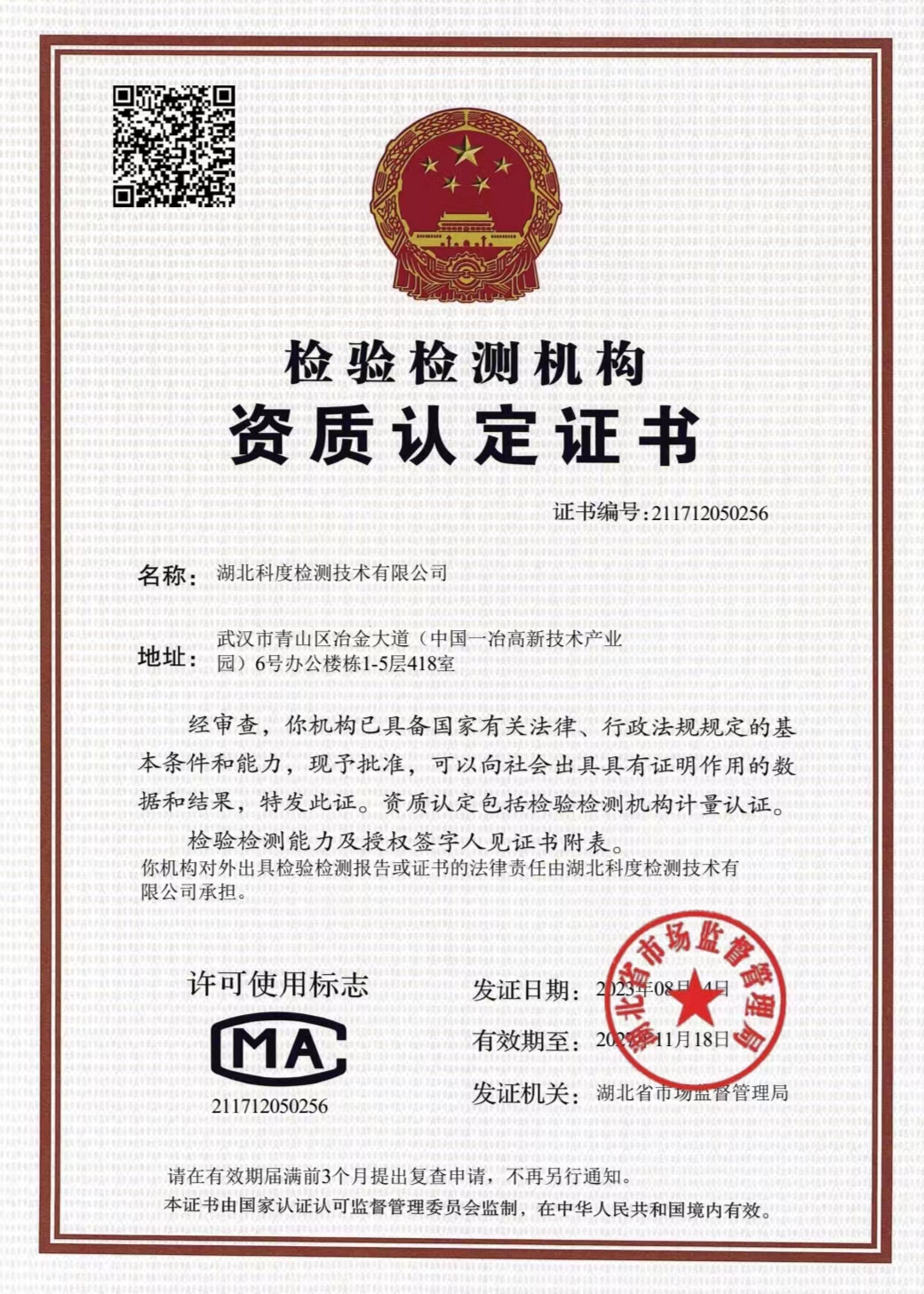 湖北科度檢測技術(shù)有限公司是一家專業(yè)從事環(huán)境類及相關(guān)領(lǐng)域檢測的第三方檢測機(jī)構(gòu),公司已通過湖北省市場監(jiān)督管理局CMA計量認(rèn)證,可以面向社會出具權(quán)威CMA檢測報告。 我公司實驗室嚴(yán)格按照國家標(biāo)準(zhǔn)建設(shè),擁有一大批國內(nèi)外先進(jìn)儀器設(shè)備及現(xiàn)代化配套設(shè)施,并有經(jīng)驗豐富的中高級專業(yè)技術(shù)人員和嚴(yán)格的實驗室質(zhì)量保證體系為項目運作提供強力支撐。 作為第三方檢測機(jī)構(gòu),公司始終以高度的社會責(zé)任感經(jīng)營企業(yè),以“公正、嚴(yán)謹(jǐn)、高效”為宗旨,依托專業(yè)的技術(shù)實力為客戶提供專業(yè)優(yōu)質(zhì)檢測服務(wù),受到政府、企業(yè)和社會各界的廣泛關(guān)注和認(rèn)可。